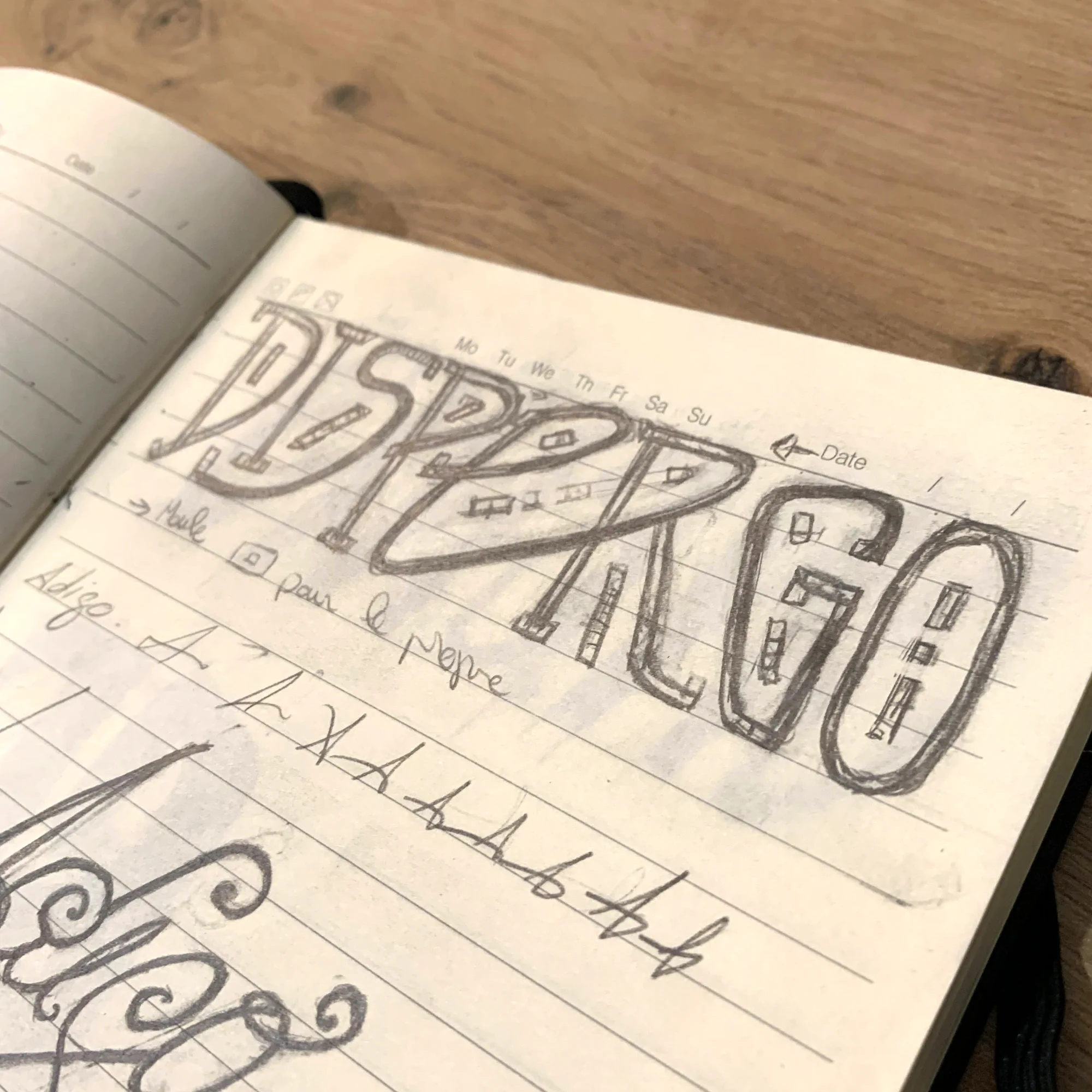 J’ai exploré différents lettrages et testé des compositions de mosaïques formant des typographies. Inspiré du mouvement Art Déco et du livre Grafica de les Rambles de Louise Fili, j’ai cherché des formes qui évoquent à la fois l’histoire des disciplines et une esthétique actuelle.