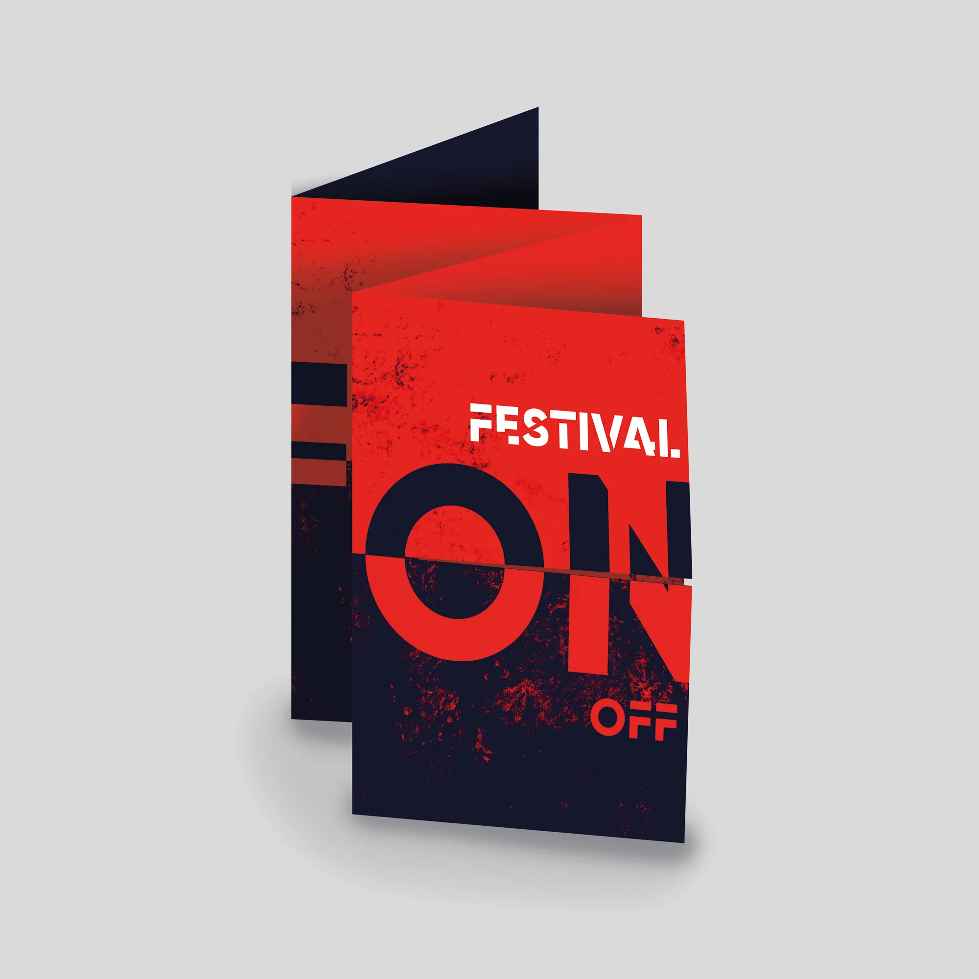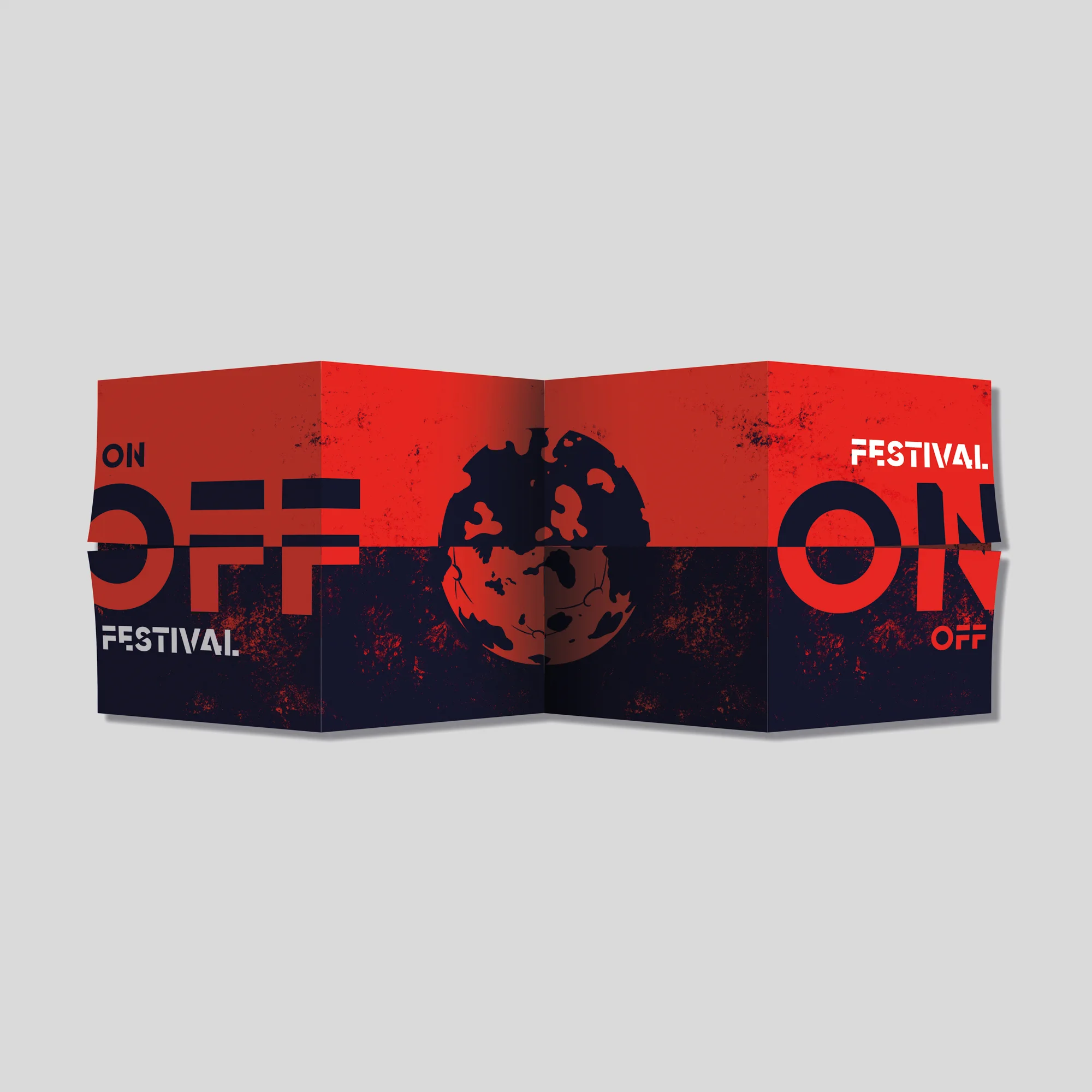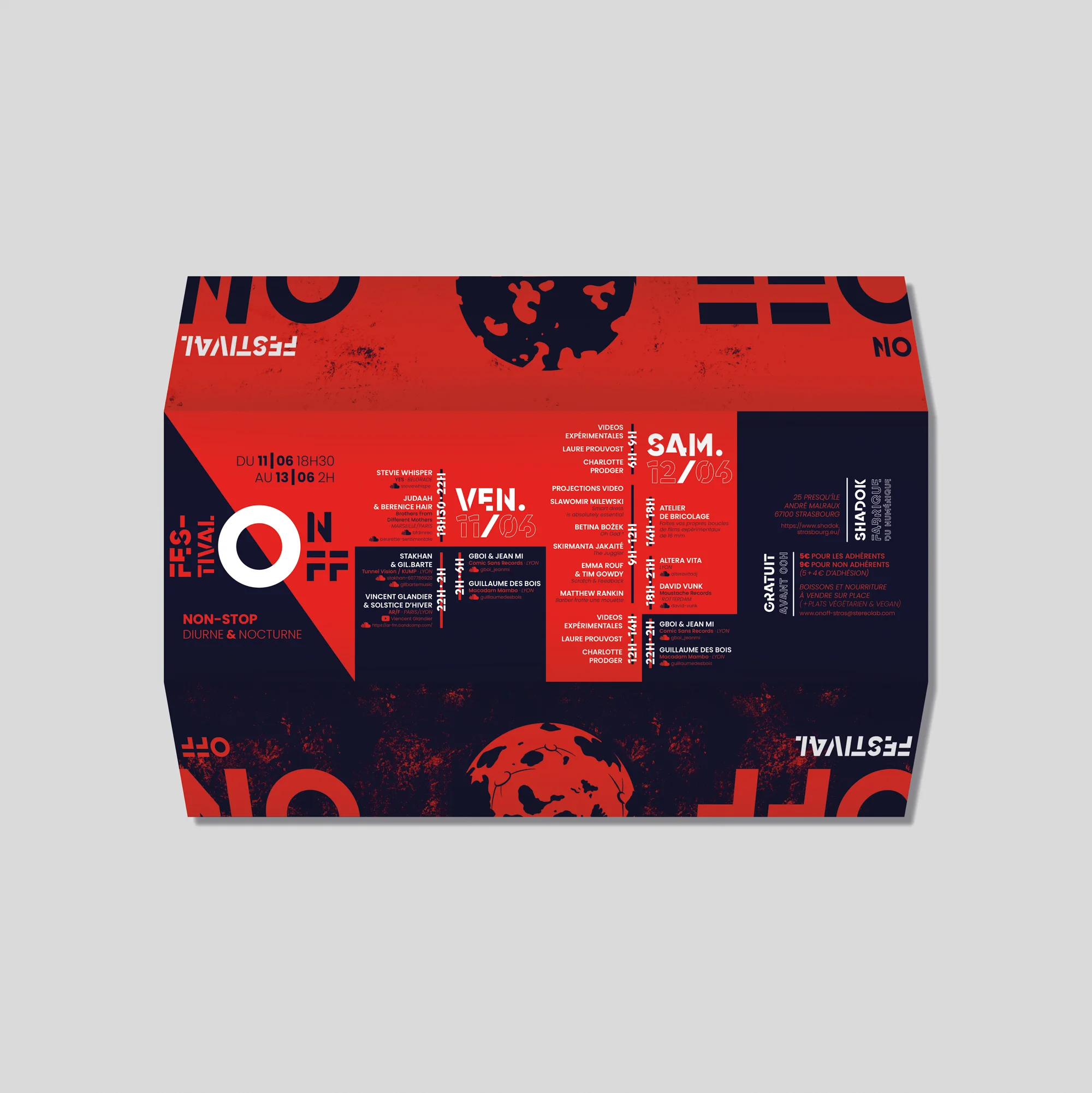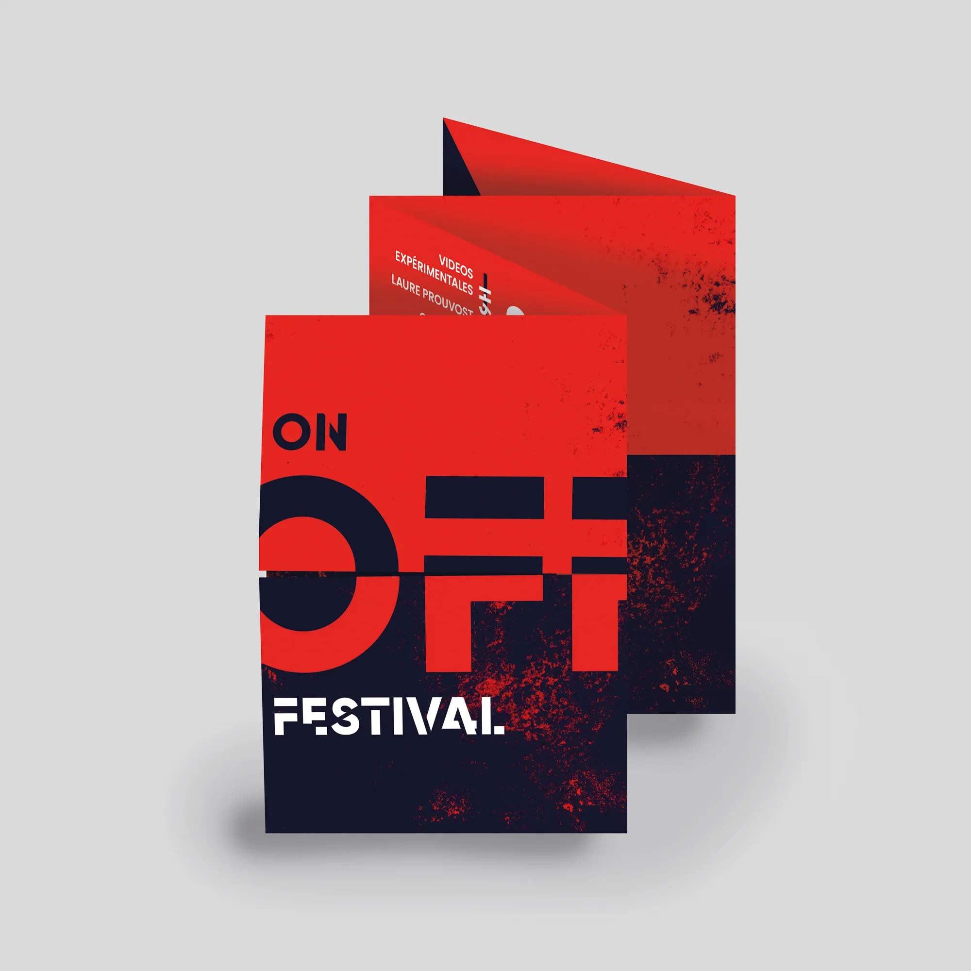 L’ergonomie était un enjeu clé : le flyer devait être facile à conserver et à lire tout au long du festival. Il fallait concevoir un support pratique et durable, tout en traduisant graphiquement l’alternance ON-OFF, jour-nuit, qui rythme l’événement.