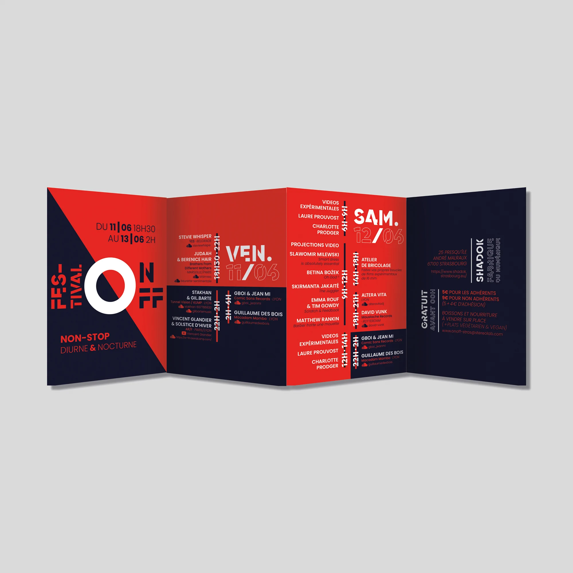 J’ai opté pour un pli en accordéon modifié, repliable jusqu’au A6, proche d’une carte de visite, ce qui facilite sa conservation. Le contraste entre rouge et bleu, soleil et lune, jour et nuit souligne l’identité du festival et renforce la lecture des phases ON-OFF.
