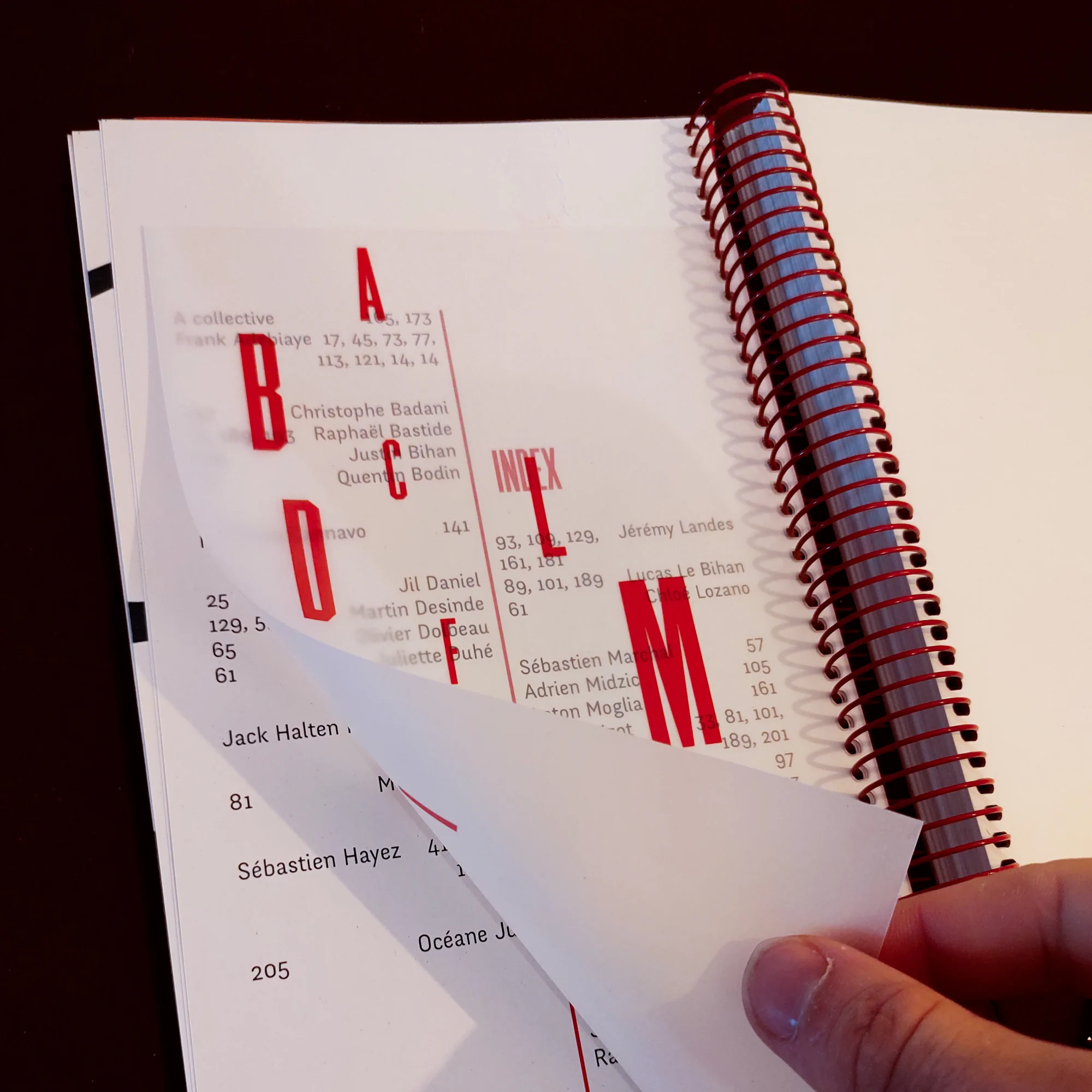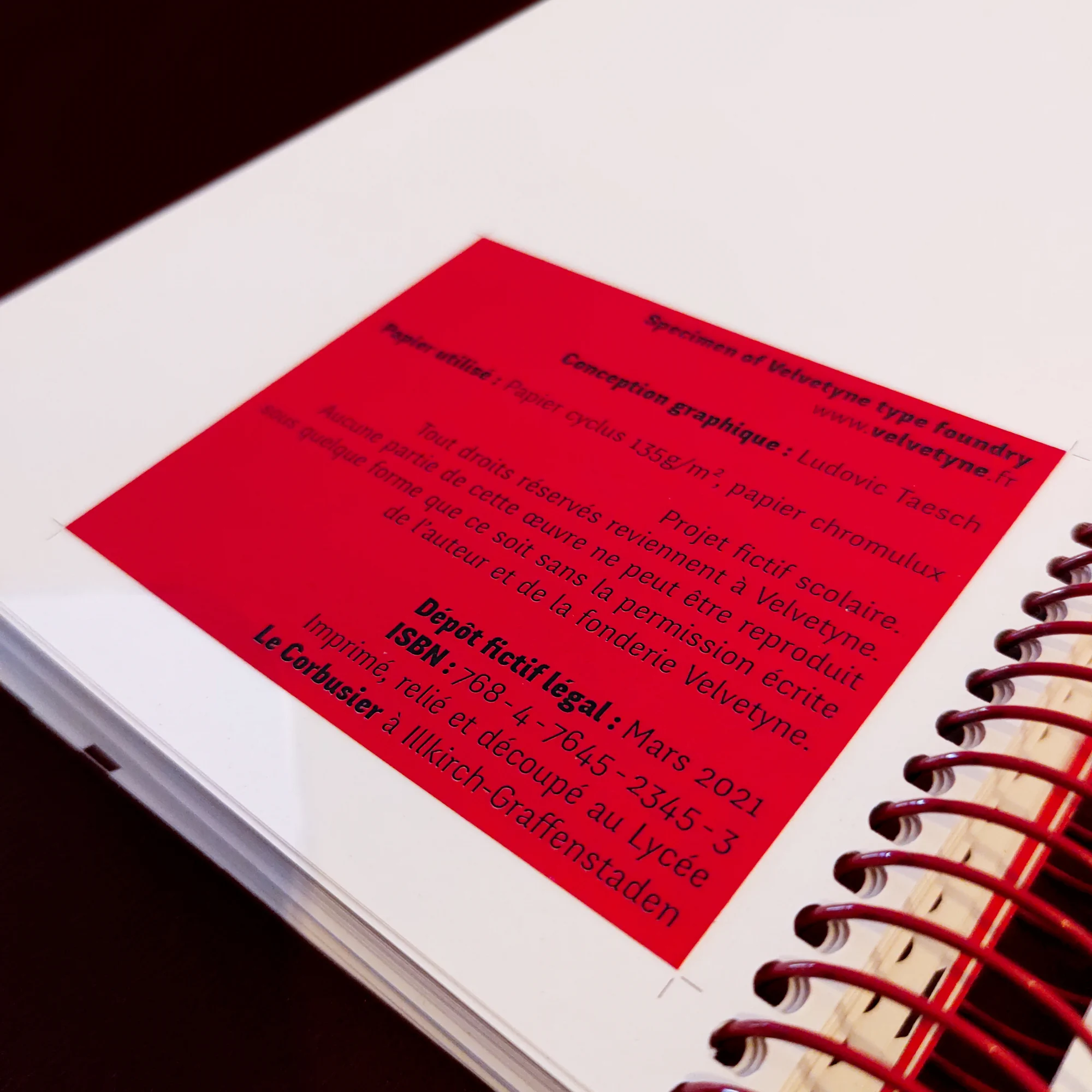Le façonnage se compose d'une découpe laser, une reliure spirale et différents papiers : chromulux pour la couverture, cyclus 135g/m² pour le cœur du livre, ainsi que du papier calque à l’intérieur du livre sur lesquels sont contre-collé des encadrés à l’image de « post-it » rappelant le côté brut, l’aspect « en travaux » et évolutif des polices de la fonderie Velvetyne.