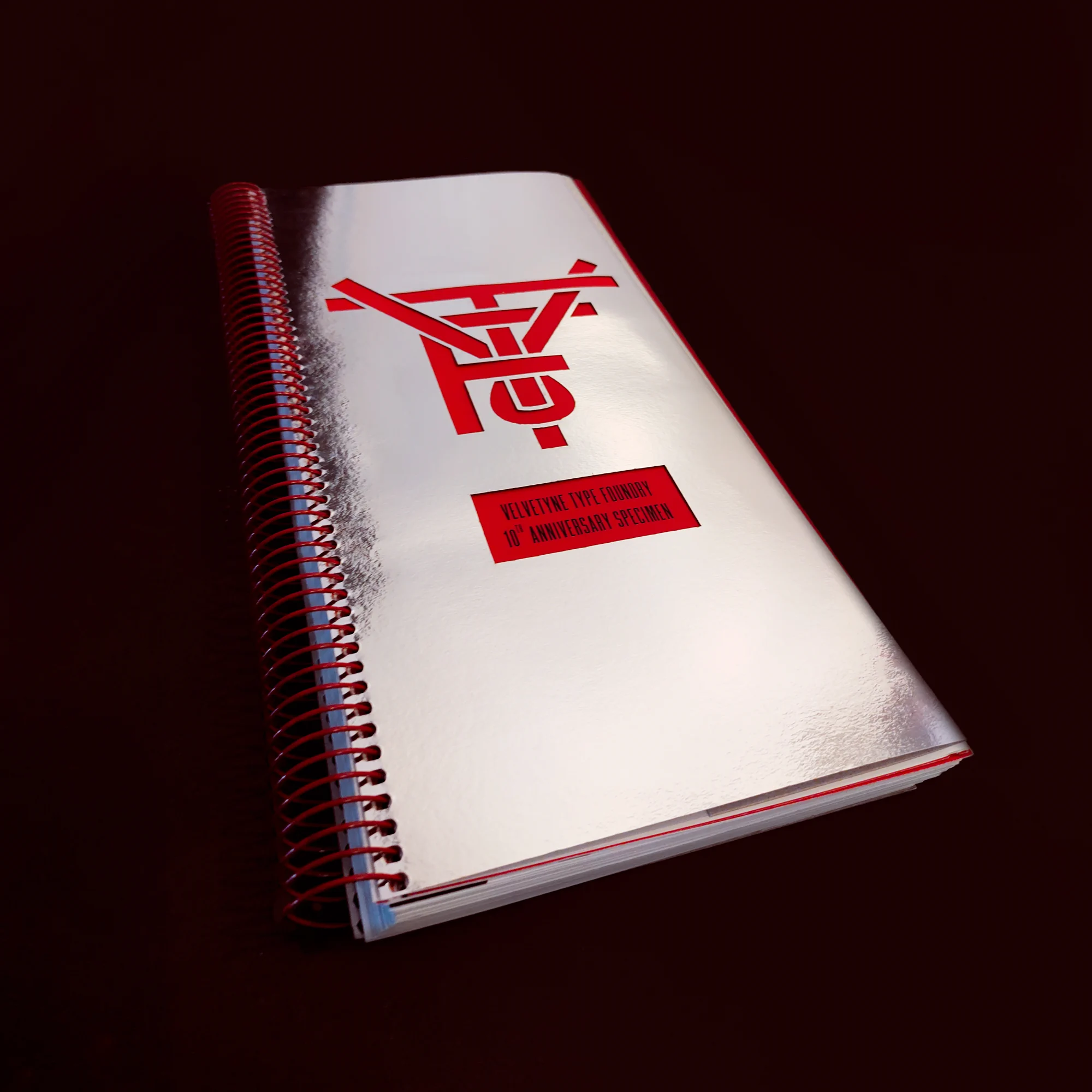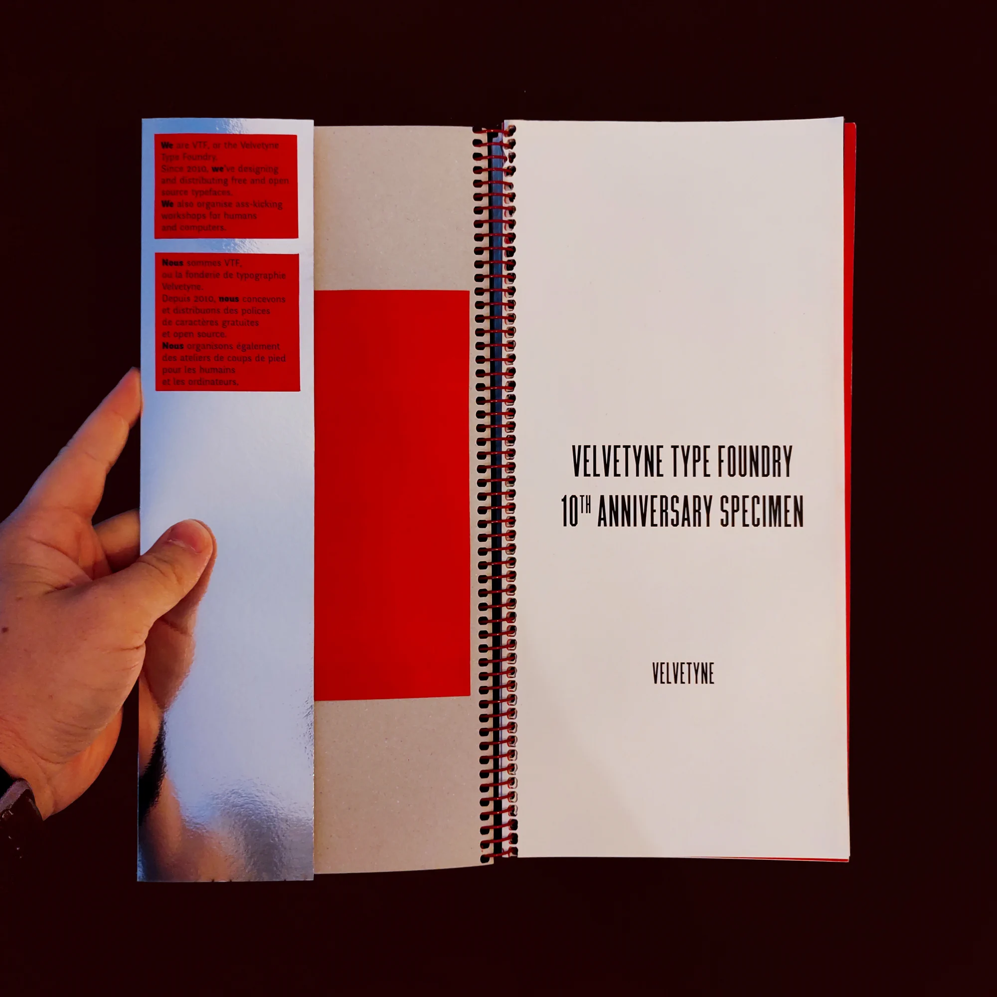 Pour célébrer et marquer les 10 ans de la fonderie open source Velvetyne, j'ai souhaité concevoir un ouvrage unique. J'adapte mon univers graphique pour valoriser le travail de la fonderie lors de l'édition d'un ouvrage.